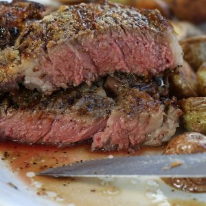 Once you have cooked your steak to the perfect temperature for you, the next step is the most important one. Rest your steak on a plate for 5-7 minutes. This allows the beef to cool slightly which redistributes the juices back into the meat. In other words, you will have an insanely juicy steak.