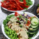This Asian Grain Bowl recipe is a mix of fresh, crisp textures and Unami flavors. Perfect for meal prep, it combines quinoa, colorful veggies, Miso Chicken and creamy Miso Tahini Dressing. Each wholesome bite is packed full of flavor and freshness.