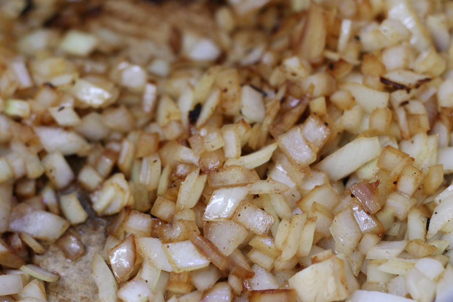 Once the beef is browned, remove from pan and transfer onto a large plate. Set aside. Add the diced onions to the beef drippings and sauté until onions are sweating, about 3 mins. Cooking the onions in the beef drippings adds a ton of flavor from the fat. Additionally, it also starts to loosen up the browned bits which also packs a punch with flavor.