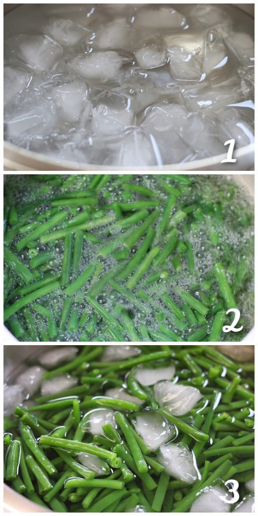 3. Remove green beans from water using skimmer and transfer to ice water. Let sit in ice water for about 5 minutes and then drain well in a colander.