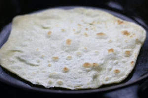 • Turn over and cook other side of tortilla for about the same amount of time. A cooked tortilla will have light to darker golden spots on both sides.