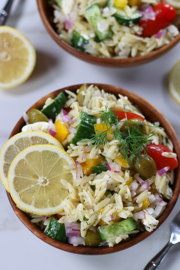 It goes without saying that this orzo salad is a great companion to seafood dishes like Marinated Grilled Shrimp Kabobs and Panko Crusted Salmon.