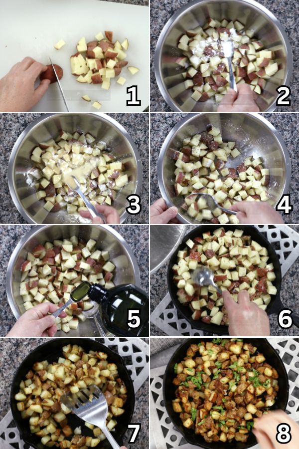- Scrub and dice your Yukon Gold or red potatoes into 1/2-inch cubes. Small even pieces are the secret to quick, consistent cooking.