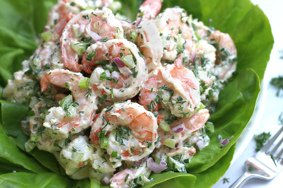 Easy Shrimp Salad with fresh dill, lemon, red onion and mayonnaise served on a bed of crisp lettuce. Fast and refreshing, this recipe is one of our favorite ways to eat dinner on hot summer days. So delicious that your taste buds will thank you.