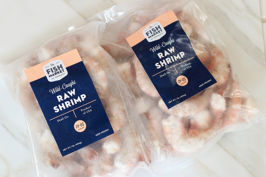 Size of Shrimp– This recipe calls for 2 pounds of shrimp. However, since shrimp sizes can range from tiny to colossal it is wise to pay attention to the count per pound. As an example, the shrimp seen in the photo below say 21-25 (sometimes packages may say 21/25). This simply means that there are 21-25 shrimp per pound. If serving just a few adults the 21/25 (jumbo), 26/30 (extra large) or 31/40 (large) works perfectly and feels like a special treat. When serving many adults the 51/60 (small), 61/70 (tiny) and 71/90 (salad size) is a much better fit.